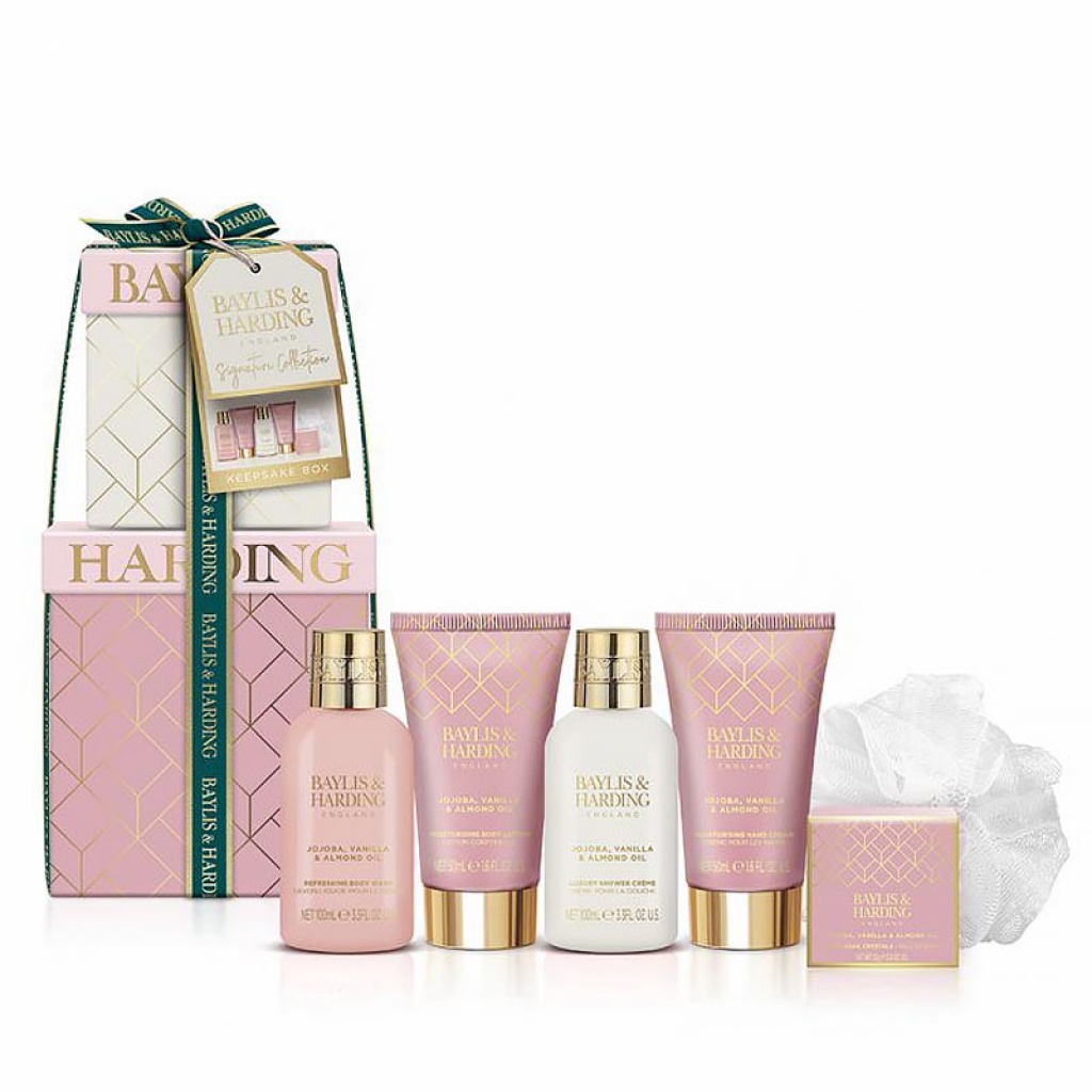 Rozkošný a obsáhlý set vás potěší mycím gelem, sprchovým krémem, tělovým mlékem, krémem na ruce, koupelovou solí a mycí žínkou. Rozmazlete vaše milované setem, který obsahuje veškeré produkty, které potřebujete k dokonalému zážitku péče o tělo. Dárková krabička v růžovém designu s černými prvky rozzáří každou koupelnu.