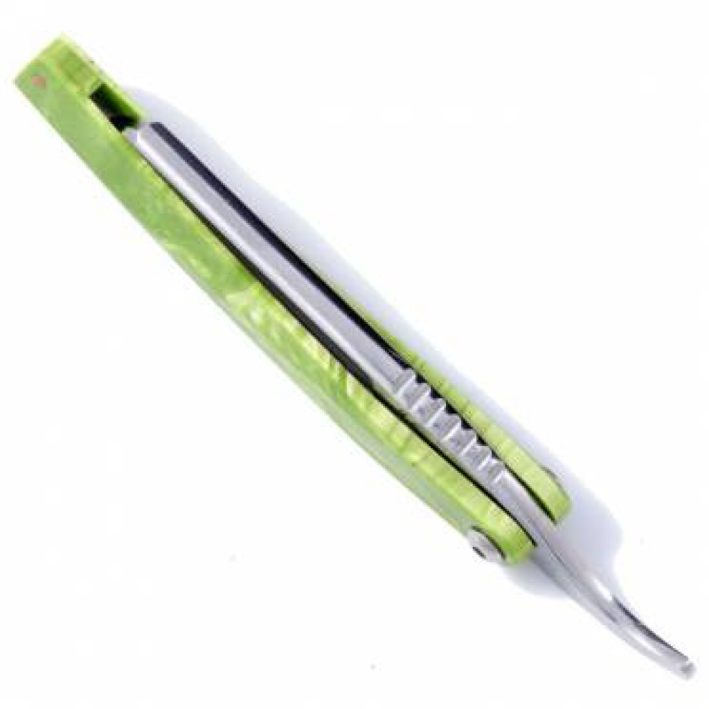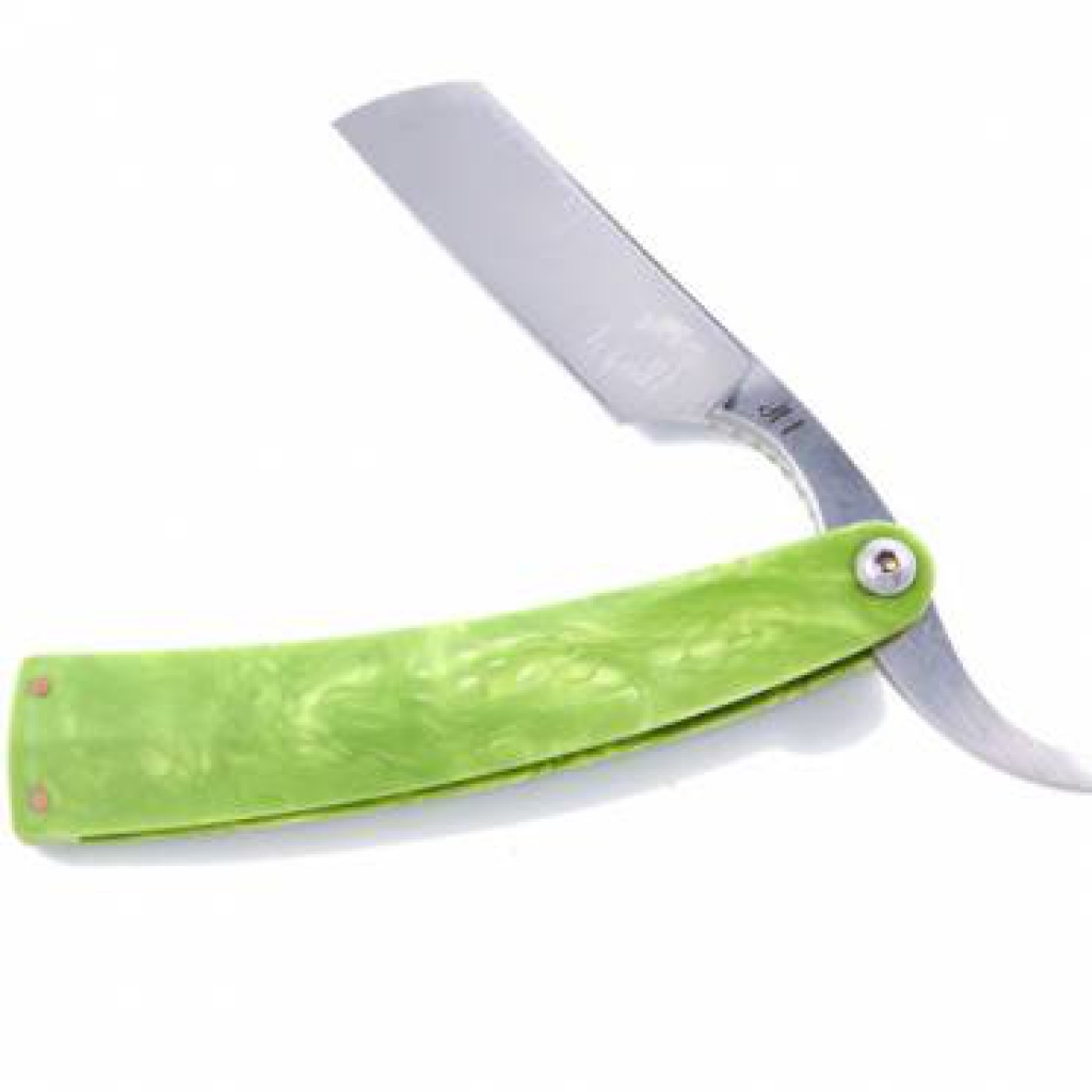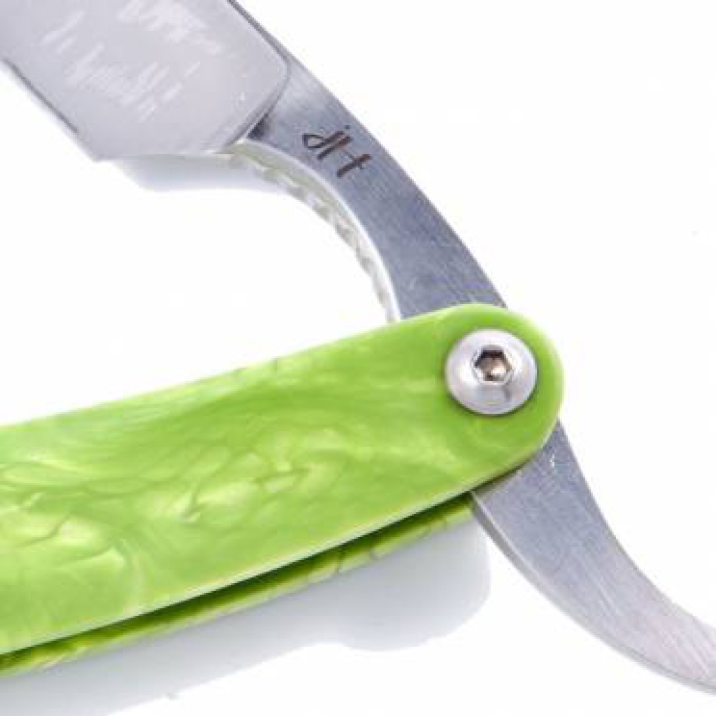 Ručně kovaná a broušená břitva z kalené nástrojové uhlíkové oceli 19 221 ČSN. Střenka je z termoplastického materiálu Juma skládajícího se ze směsi minerálních látek a pryskyřičné složky.