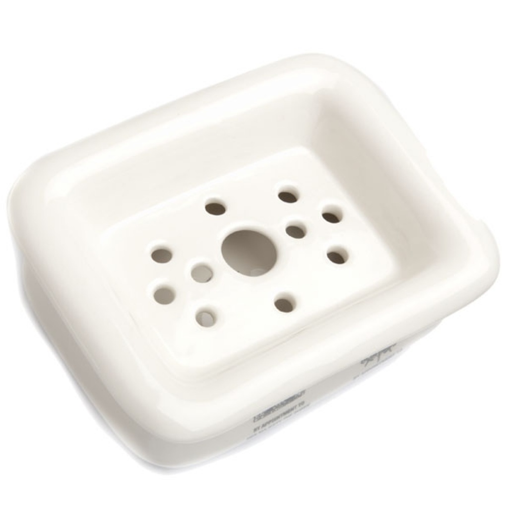 Dvoudílný keramický mýdelník s originálním vzhledem. Předností tohoto mýdelníku je odnímatelná děrovaná vrchní část, díky které odkape přebytečná voda z mýdla do spodní části, odkud se dle potřeby snadno vyleje.