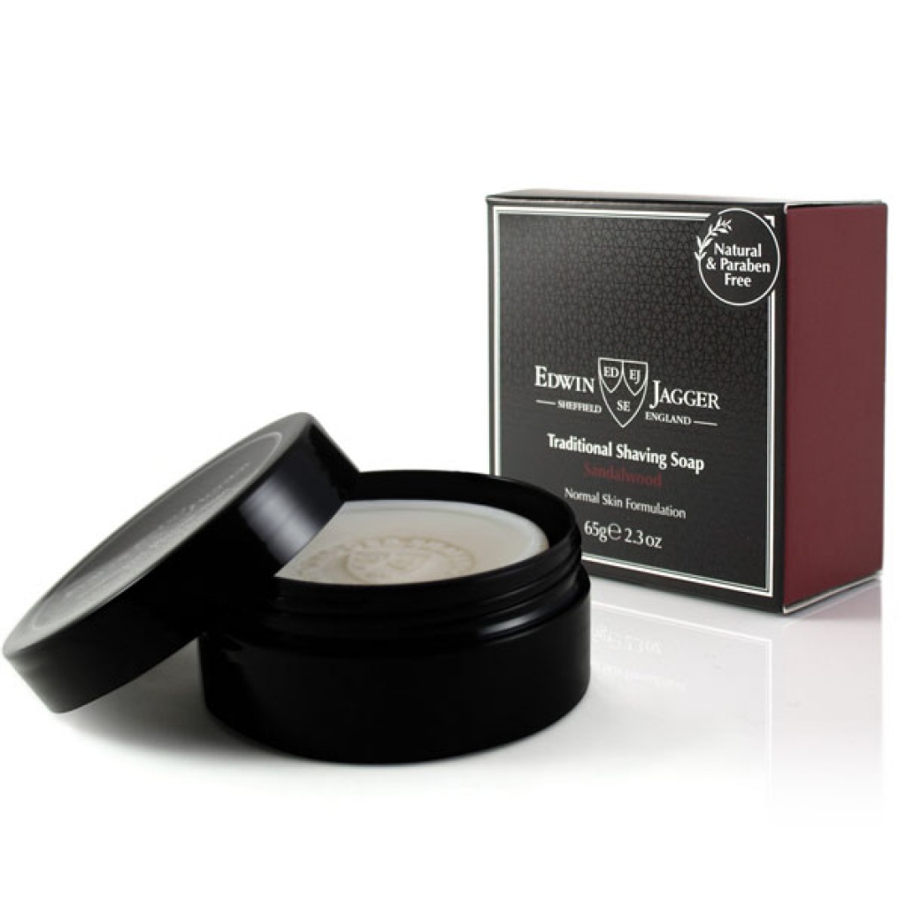 Mýdlo na holení v praktické misce, jenž je z 99% vyrobeno z přírodních ingrediencí s klasickou dřevitou vůní santalového dřeva.