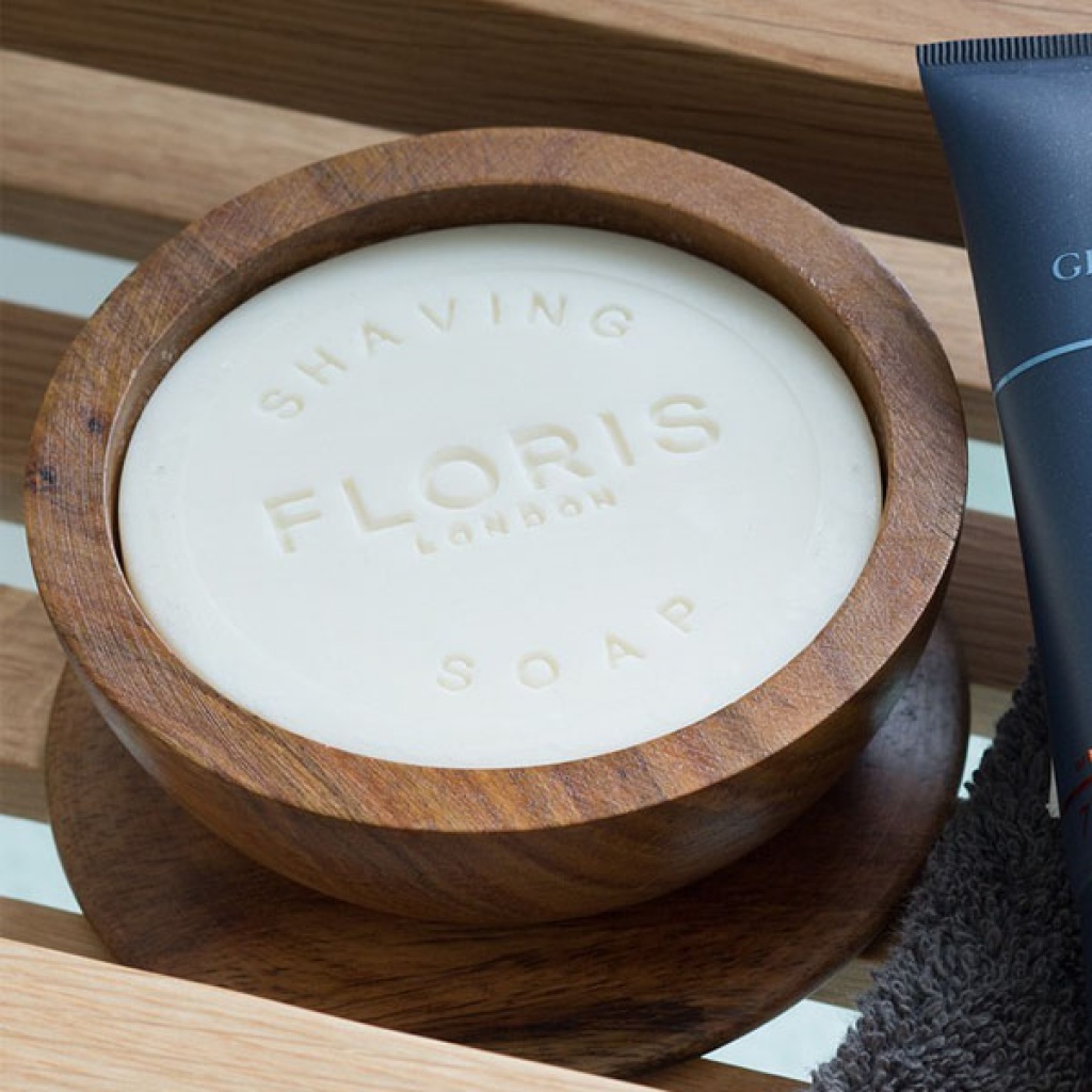 Mýdlo na holení Floris obsahuje směs olejů, která vytváří bohatou krémovou pěnu, která umožňuje čepeli snazší klouzání po tváři.