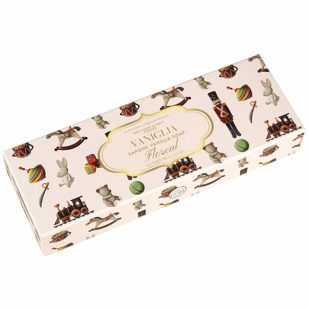 Sada ručně vyráběných mýdel s vůní vanilky. Mýdla jsou za studena lisované starodávnou technologií užívané ve Florencii. Kromě vůně je jeho další předností přírodní složení.