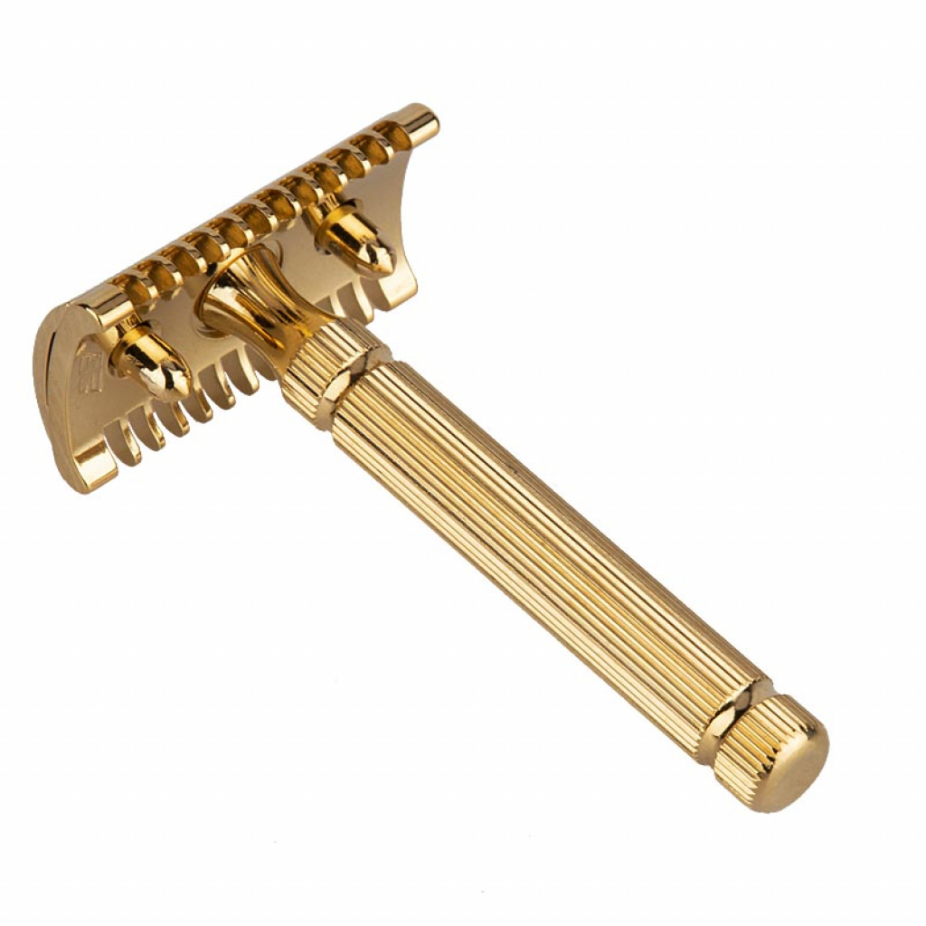 Legendární italský holicí strojek na žiletky s otevřeným hřebenem ve zlatém zbarvení. Díky odkrytější žiletce a menšímu prohnutí žiletky je spíše vhodný pro pokročilejší uživatele. Má skvělé vyvážení, perfektní přilnavost rukojeti a leštěnou niklovou hlavici. Strojek je vhodný delší vousy nebo pro vyznavače velmi hladkého oholení.