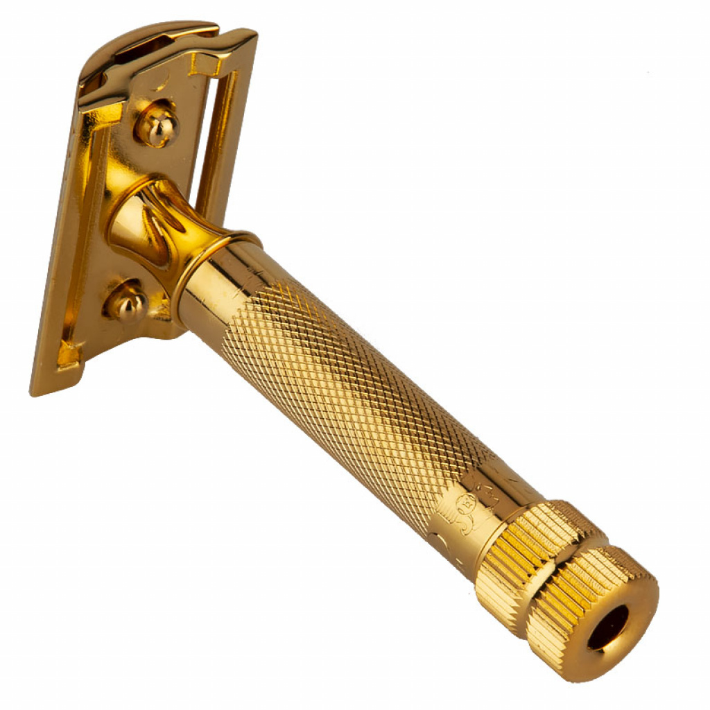 Pozlacený kovový holicí strojek na klasické žiletky od firmy Merkur Solingen. Méně agresivní hlavice je vhodná pro častější holení. Texturovaná rukojeť umožní bezpečnější držení strojku.