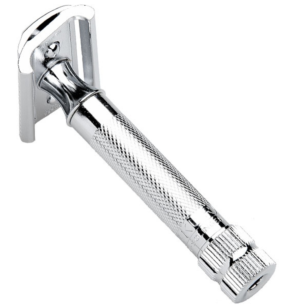 Pochromovaný kovový holicí strojek na klasické žiletky od německé firmy Merkur Solingen. Záměrně zakřivená hlavice žiletku více zafixuje a ostří žiletky nechá více vykouknout. Tím je strojek více agresivní a je tak vhodný pro holení tvrdých a velmi tvrdých vousů. Texturovaná rukojeť umožní bezpečnější držení strojku.