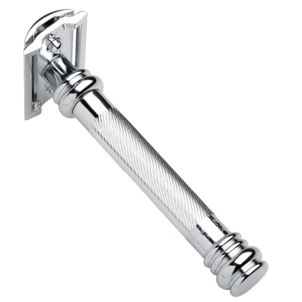 Pochromovaný kovový holicí strojek na klasické žiletky od firmy Merkur Solingen. Méně agresivní hlavice je vhodná pro častější holení. Jeho předností je vyšší váha, díky které nemusíte na strojek tlačit. Vroubkovaná rukojeť umožní bezpečnější držení strojku.
