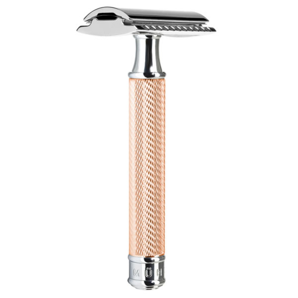 Holicí strojek na žiletky s růžovozlatou chromovanou rukojetí od firmy Mühle. Balení obsahuje i testovací žiletku stejného výrobce.