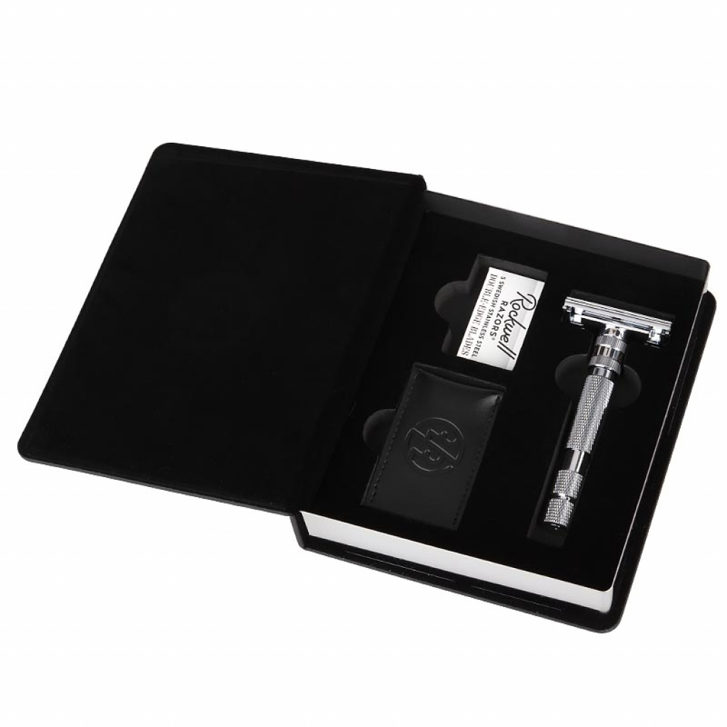 Holicí strojek Rockwell T2 je dodáván s pevným cestovním pouzdrem ve tvaru knihy, zároveň s jedním balíčkem žiletek Rockwell a s koženou nasazovací krytkou.