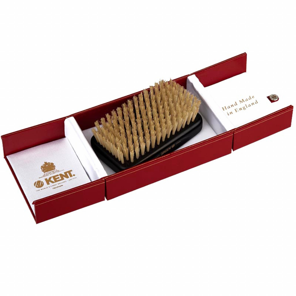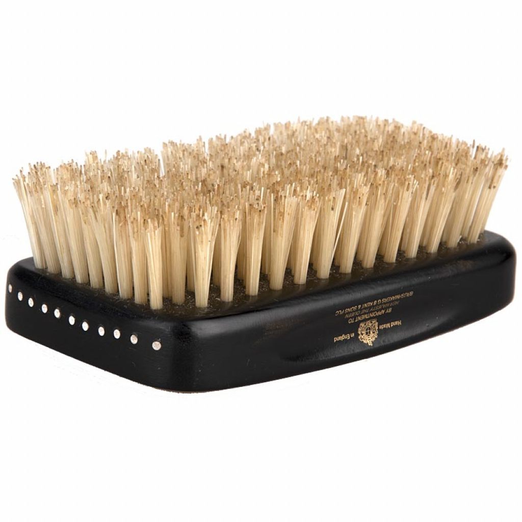 Kompletně ručně vyrobený kartáč na vlasy typu military. Obsažené nejjemnější přírodní štětiny napomáhají distribuci přírodních olejů k přirozenému lesku. Dřevěná lkaovaná rukojeť z ebenového dřeva a ručně vyšívané štětiny dělají z kartáče unikátní výrobek. Luxusní přidanou hodnotu nabyde i hedvábím vyplněné krabičce.