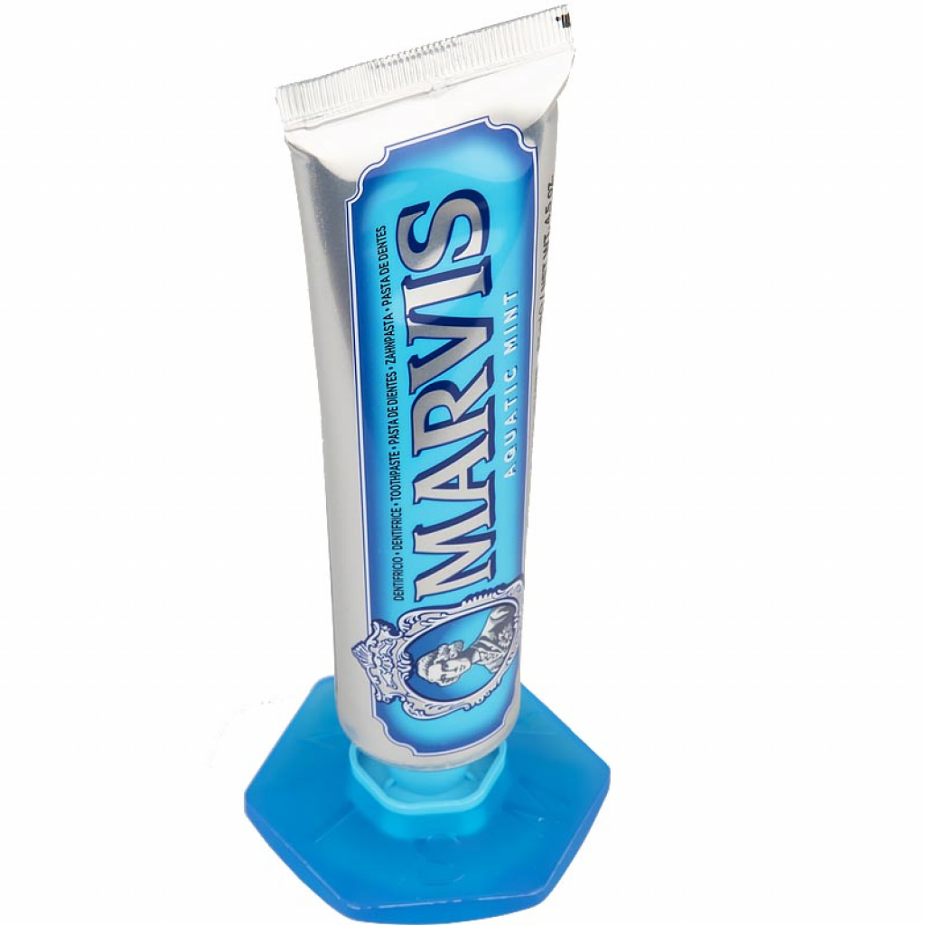 Modrý plastový stojánek na zubní pasty Marvis o velikosti 75 ml, 85 ml a 25 ml. Dopřejtee zubním pastám Marvis i stylový stojánek.