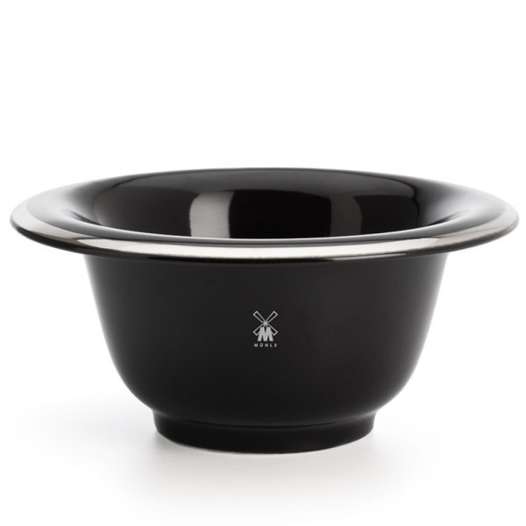 Černá porcelánová miska na holení s pokoveným okrajem Mühle, v níž vytvoříte bohatou pěnu.