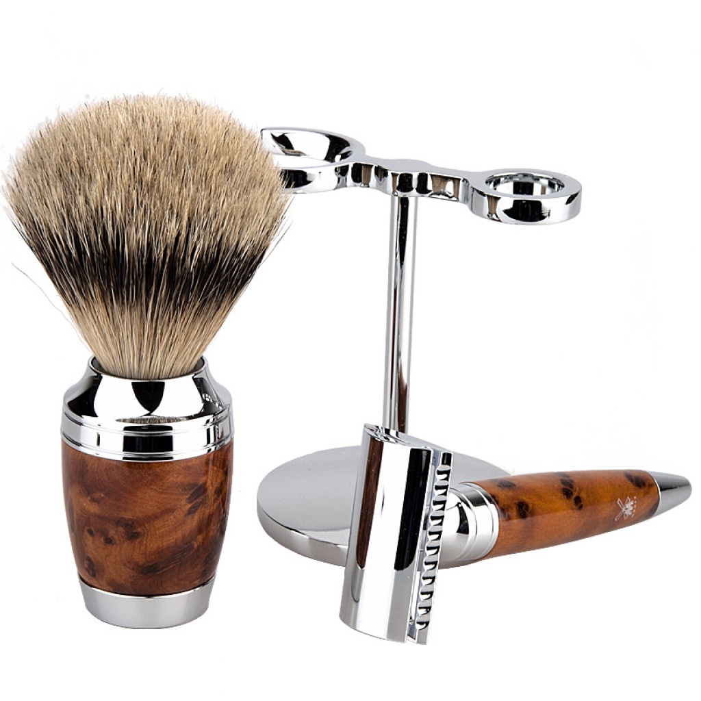 Štětka se štětinami Silvertip badger a žiletkový holicí strojek jsou vyrobeny ze zlatohnědého dřeva stromu thuja s chromovanými detaily.