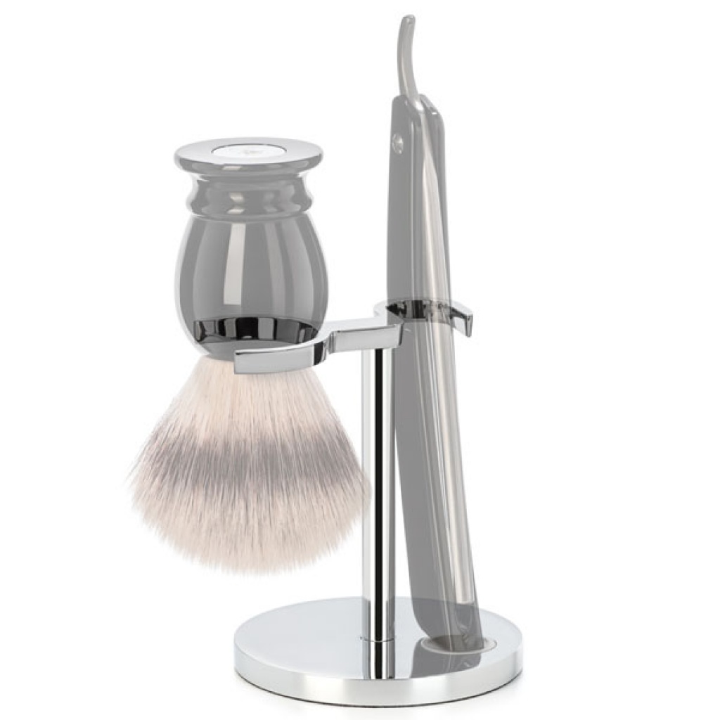 Chromovaný stojánek na štětku, holicí strojek nebo břitvu.