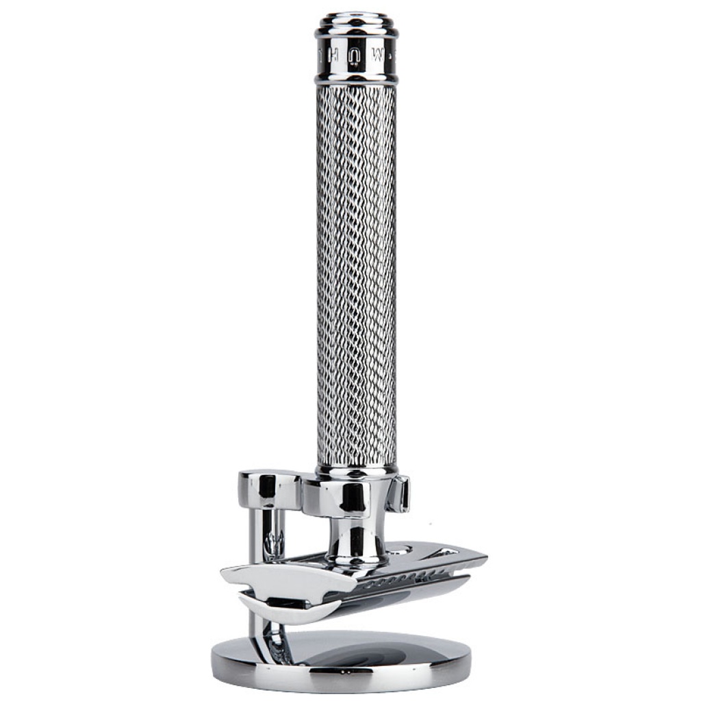 Mosazný chromovaný stojánek na holicí strojky značky Mühle. Vhodný pro typy R89, R107, R106, 103, 108, R41, R101, R102 a typy Grande.