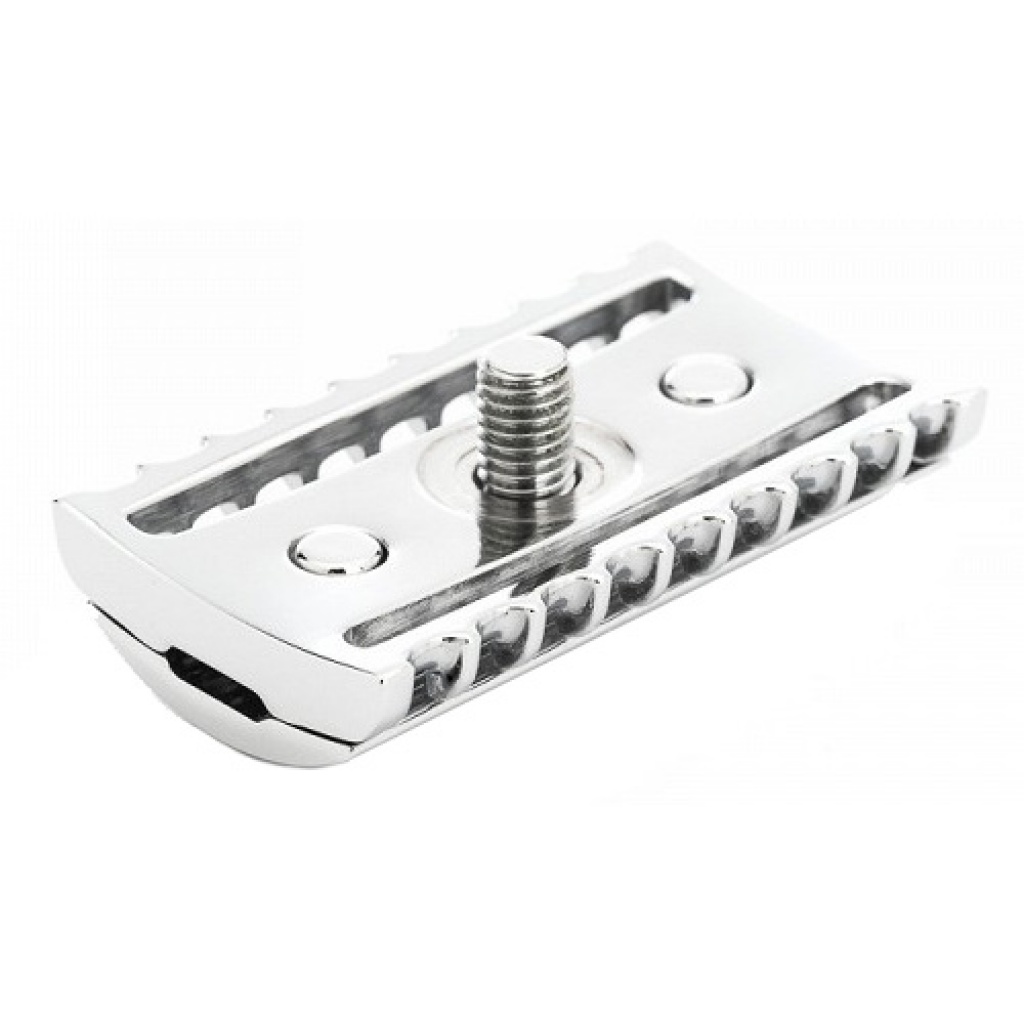Více agresivní dvoudílná hlavice pro rukojeti tradičních žiletkových strojků značky Mühle.