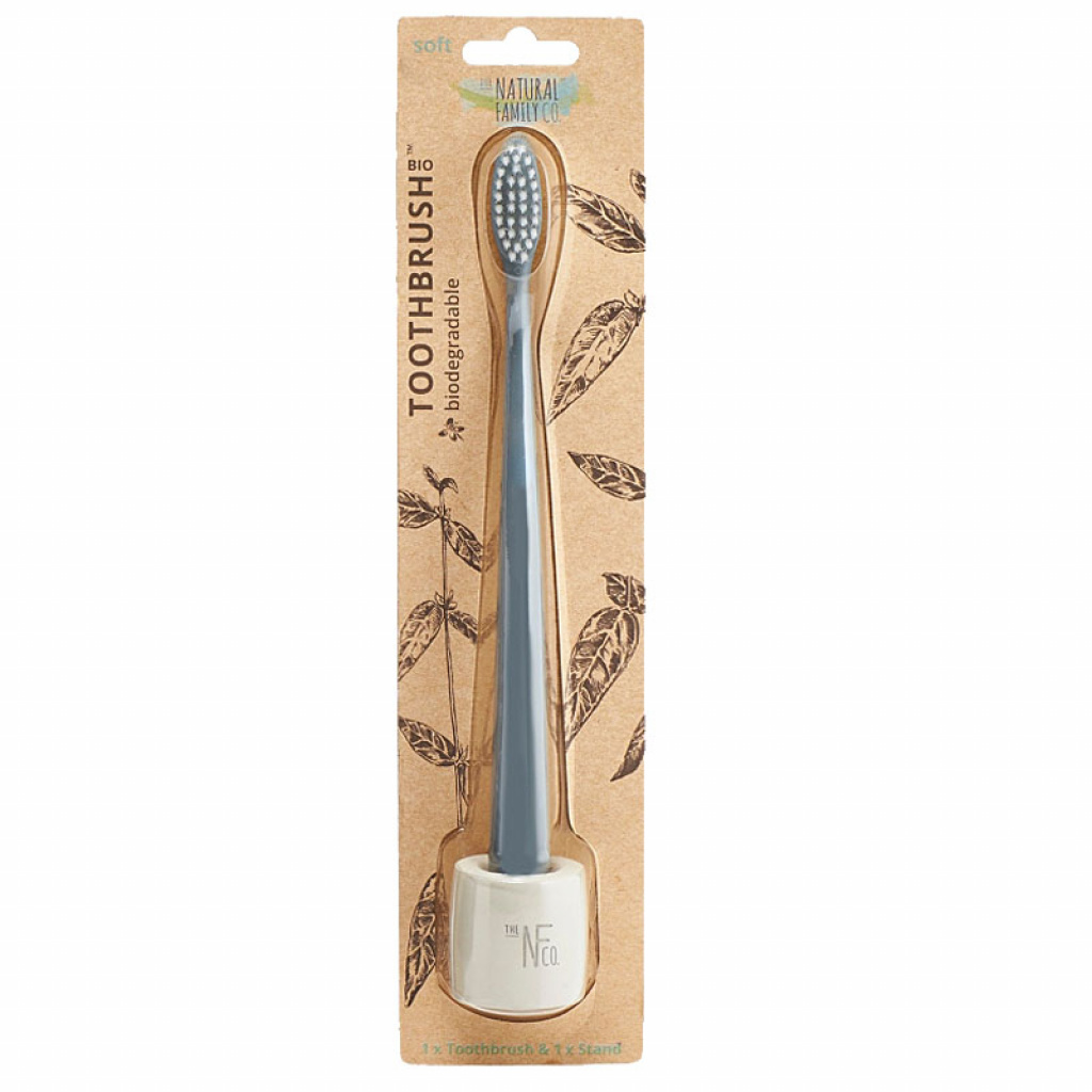 NFco. bio zubní kartáček s měkkými nylonovými štětinkami a rukojetí vyrobenou z kukuřičného škrobu. Balení obsahuje i praktický stojánek z tvrzené pryskyřice.