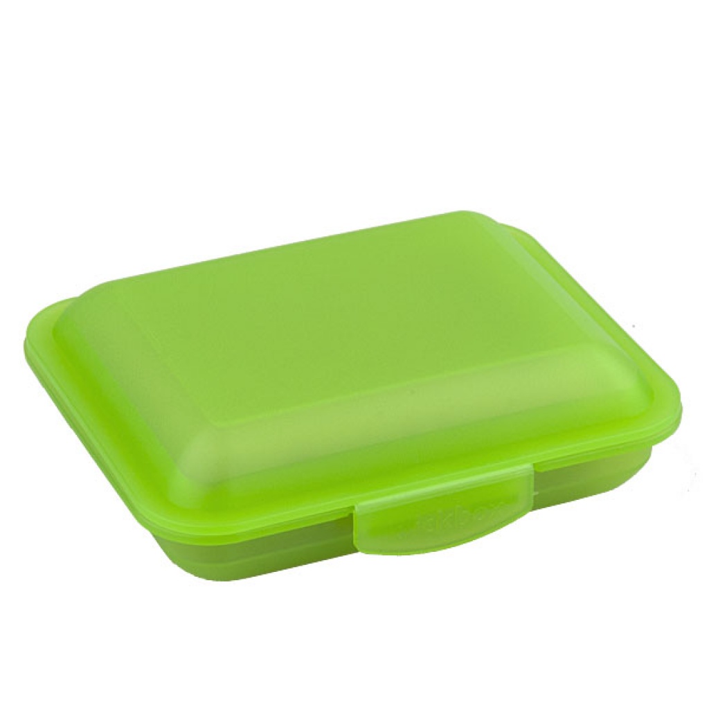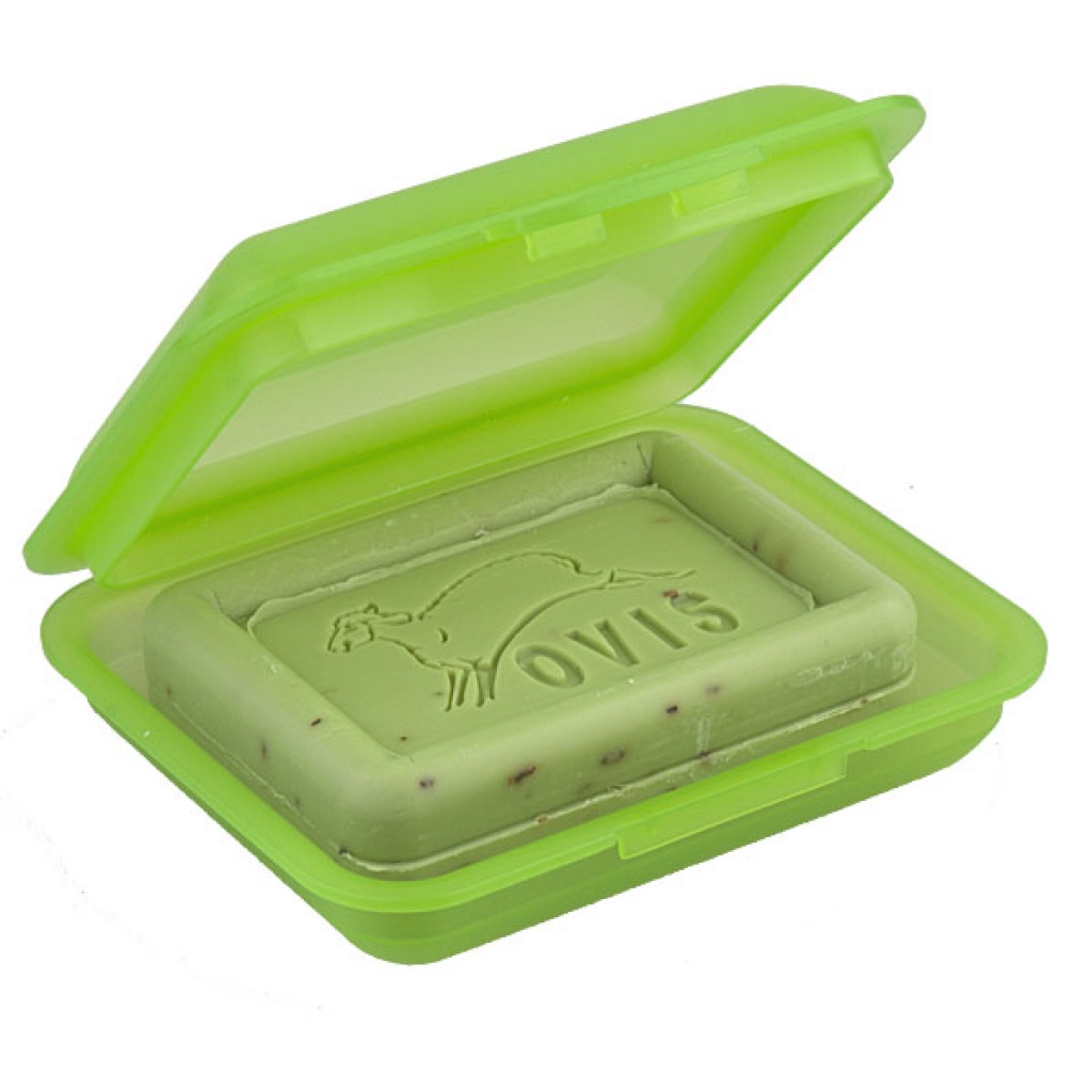 Lehce průhledná plastová krabička na uchování mýdla na cestách.