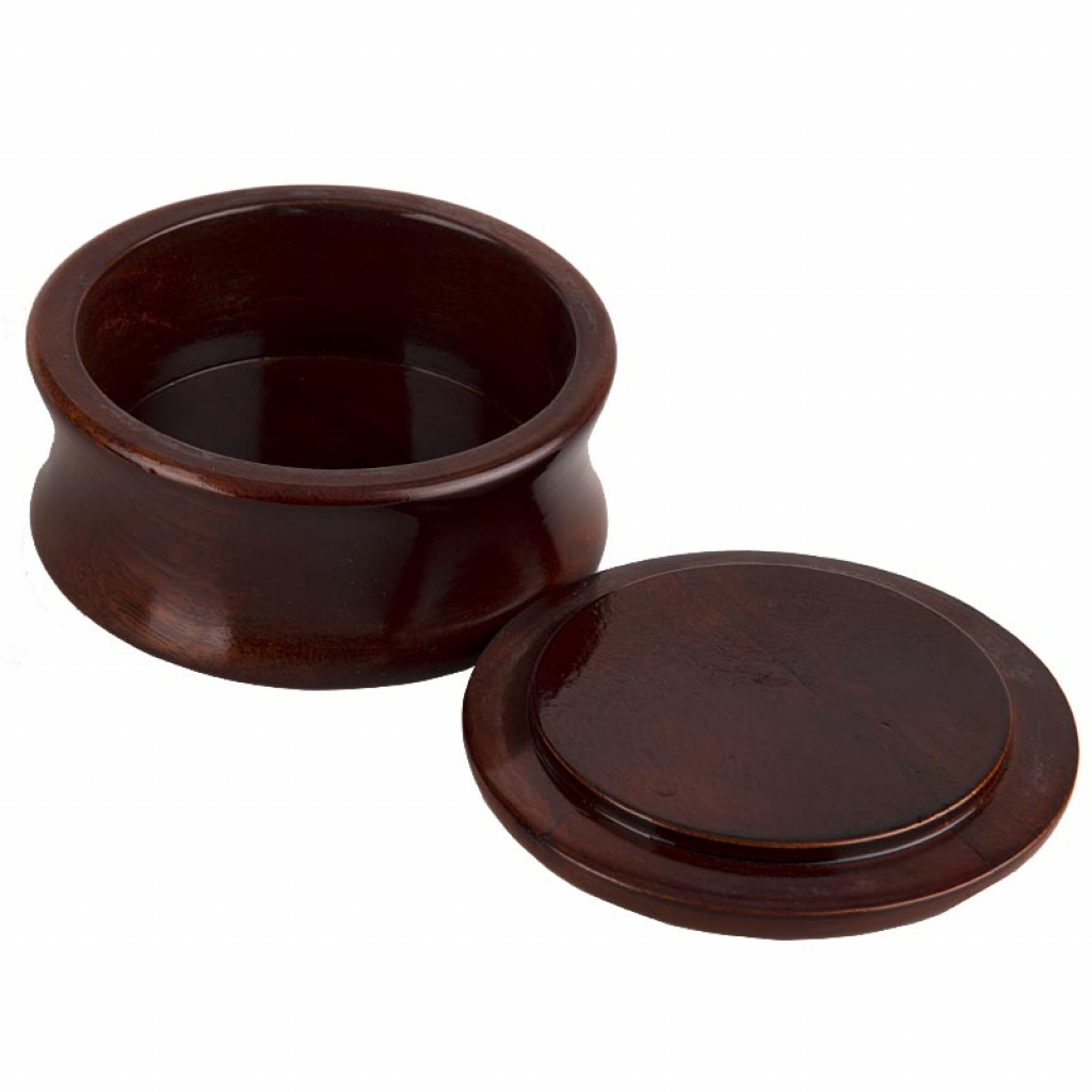 Ručně vyráběna miska s víkem na mýdlo na holení. Miska je vyrobena z lakovaného mangového dřeva.