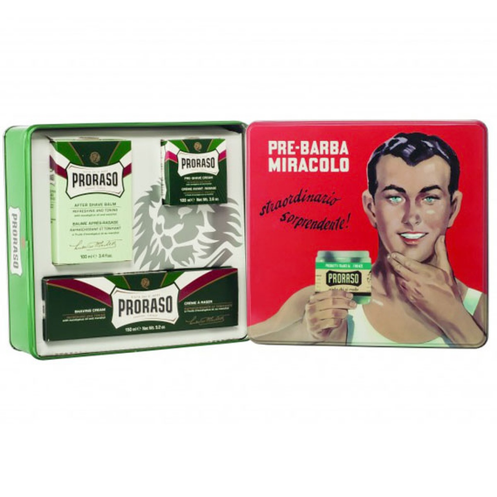 Plechová dárková krabice s holicími přípravky v retro stylu. Sada potěší všechny, kteří mají v oblibě zelenou řadu Proraso - pro normální pokožku.