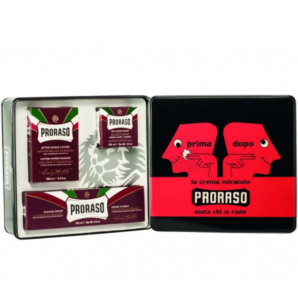 Plechová dárková krabice v retro stylu potěší všechny, kteří mají v oblibě červenou řadu Proraso - pro tvrdé vousy.