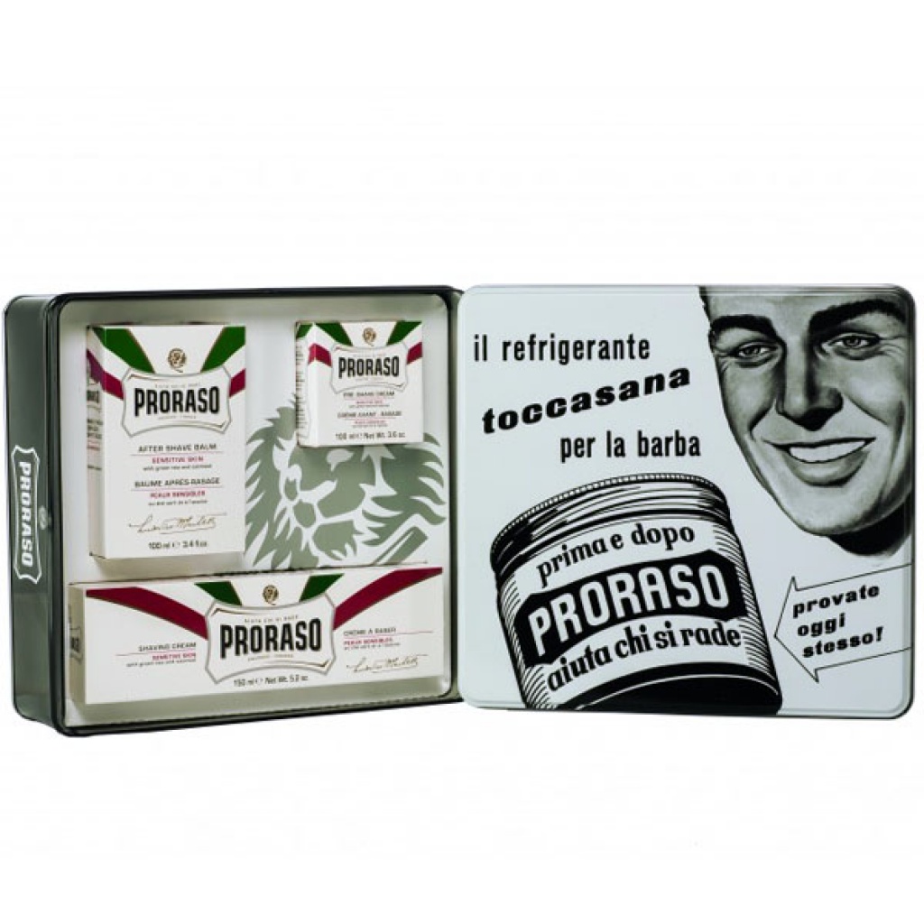 Plechová dárková krabice v retro stylu potěší všechny, kteří mají v oblibě bílou řadu Proraso - pro citlivou pokožku.