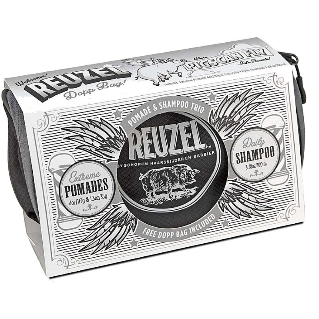 Dárková sada se závěsnou kosmetičkou taštičkou, matnou pomádou Extreme Hold 113 g a její 35 g cestovní variantou, včetně cestovního balení šamponu (100 ml) vhodného i na denní použití.