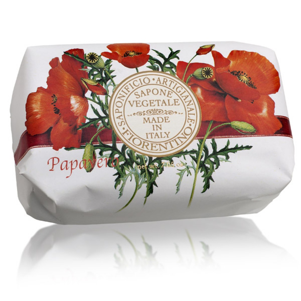 Ručně balené mýdlo s vůní makového květu. Použít lze nejen na mytí, ale také jako voničku do skříní, ložního prádla či do koupelny. Mýdlo je ozdobené vyraženým reliéfem lilie, která je symbolem Florencie.