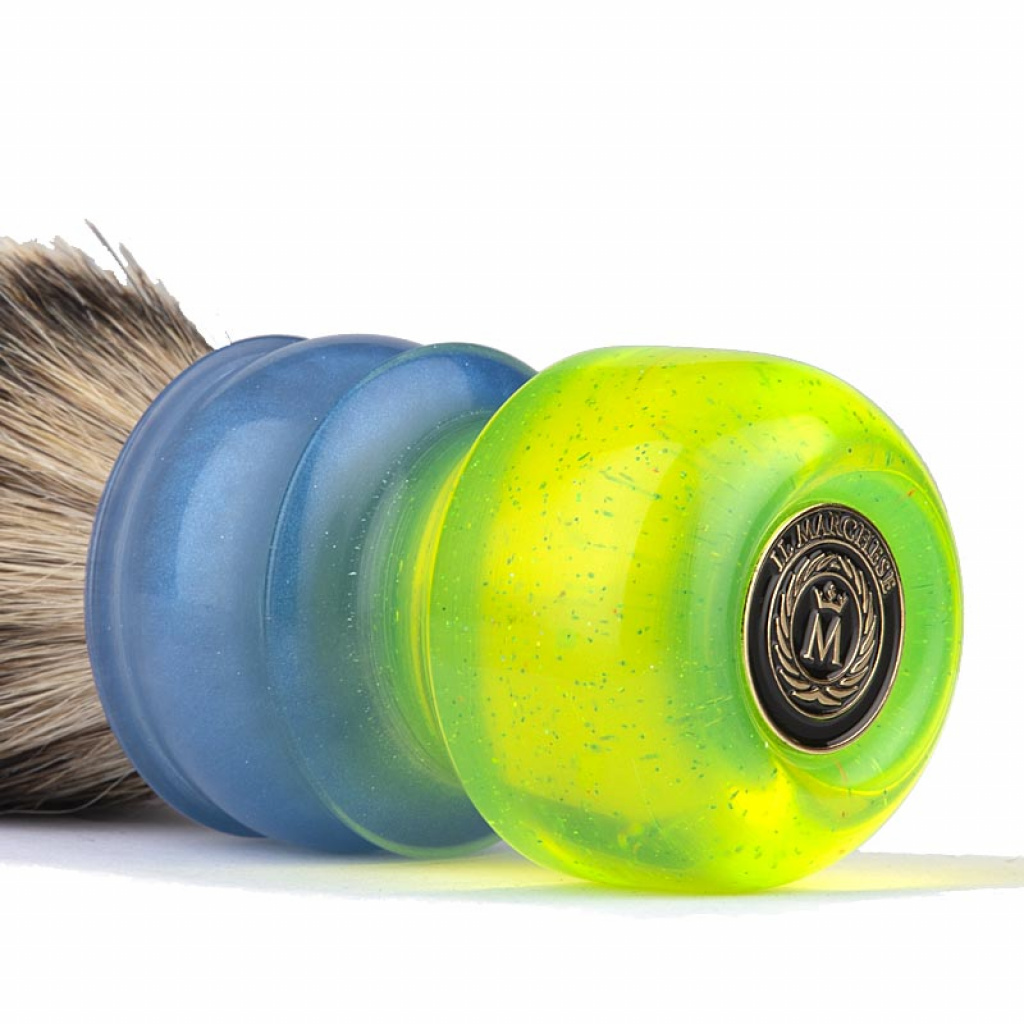 Odolná rukojeť je vyrobena z perleťově modré, fluorescenční zelené a modré pigmentované pryskyřice. Vespod je zdobena kovovou značkou písmene M, typickou pro produkty Il Marchese. Staňte se jidným majitelem na světě tohoto jedinečného nereprodukovaného kusu.