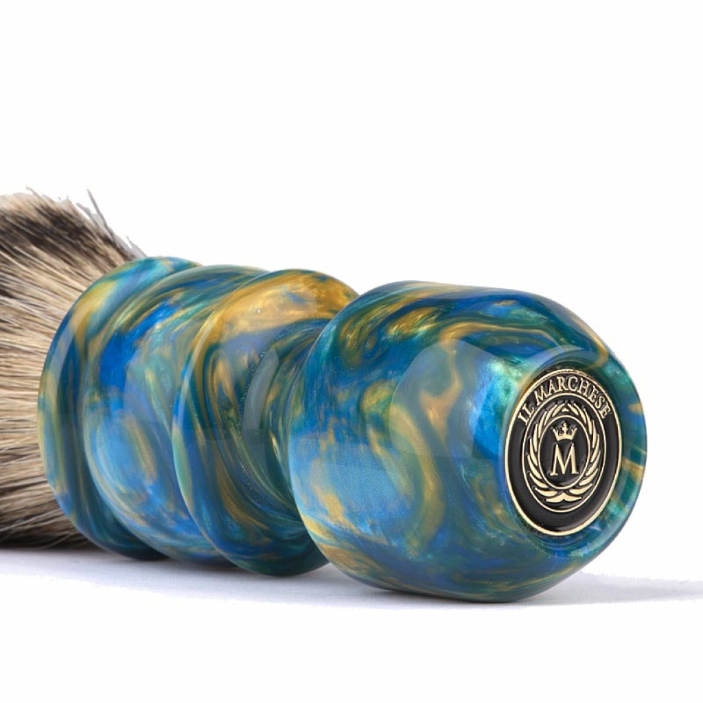 Odolná rukojeť je vyrobena z perleťově modré pigmentované pryskyřice se zelenými a zlatožlutými žilkami. Vespod je zdobena kovovou značkou písmene M, typickou pro produkty Il Marchese. Staňte se jidným majitelem na světě tohoto jedinečného nereprodukovaného kusu.
