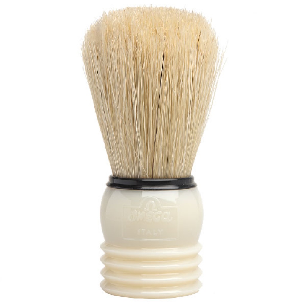 Štětka Omega z prasečích štětin, které se vyznačují svou větší hrubostí oproti jezevčím štětinám. To však není na škodu, protože mají nejen silnější masážní efekt, ale taktéž při nanášení mýdla či pěny na holení efektivně odstraňují odumřelou pokožku.