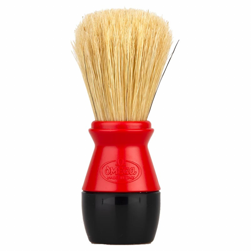 Štětka Omega z prasečích štětin, které se vyznačují svou větší hrubostí oproti jezevčím štětinám. To však není na škodu, protože mají nejen silnější masážní efekt, ale taktéž při nanášení mýdla či pěny na holení efektivně odstraňují odumřelou pokožku. Rukojeť je vyrobena z plastu.