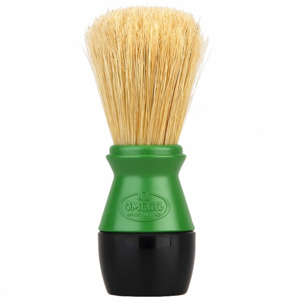Štětka Omega z prasečích štětin, které se vyznačují svou větší hrubostí oproti jezevčím štětinám. To však není na škodu, protože mají nejen silnější masážní efekt, ale taktéž při nanášení mýdla či pěny na holení efektivně odstraňují odumřelou pokožku. Rukojeť je vyrobena z plastu.