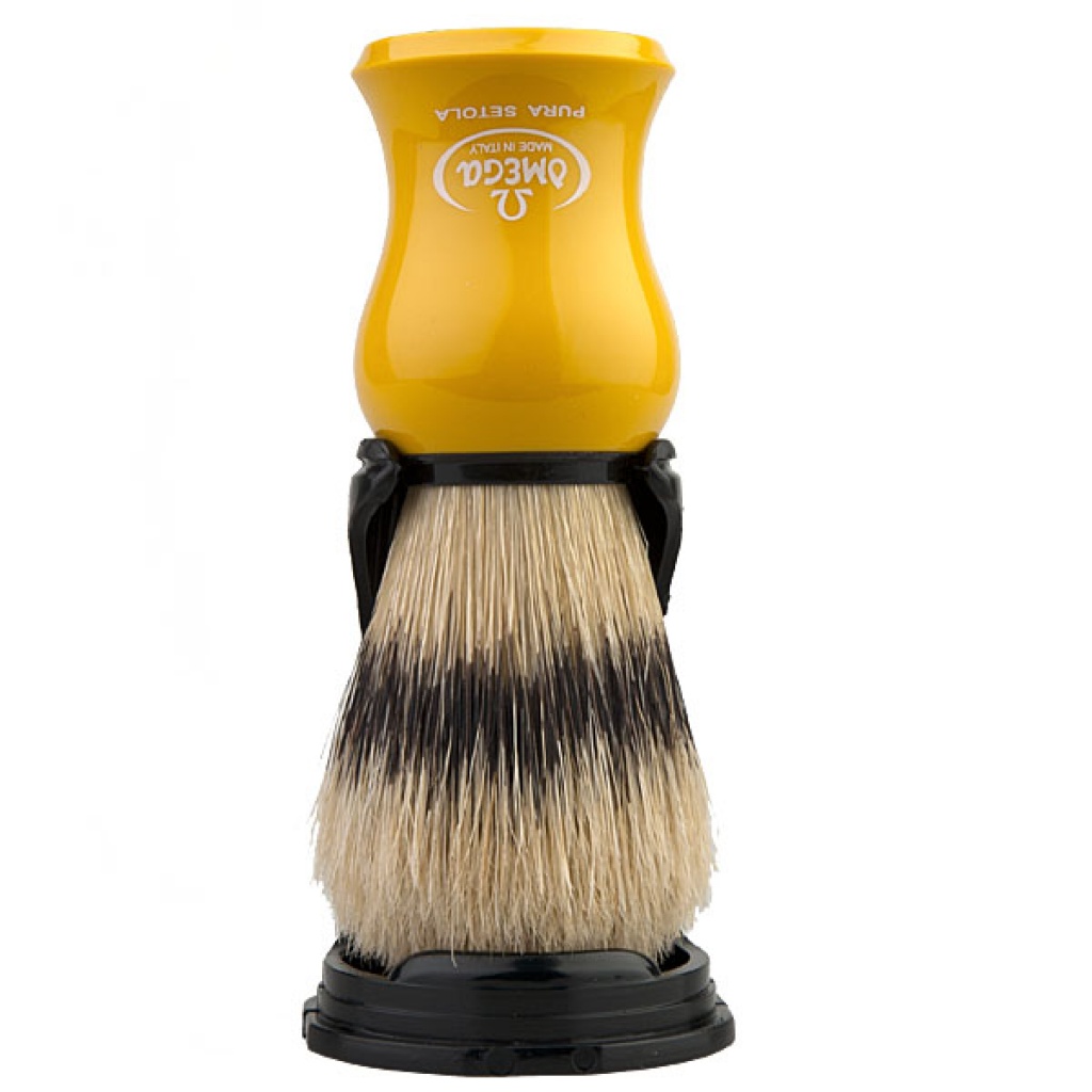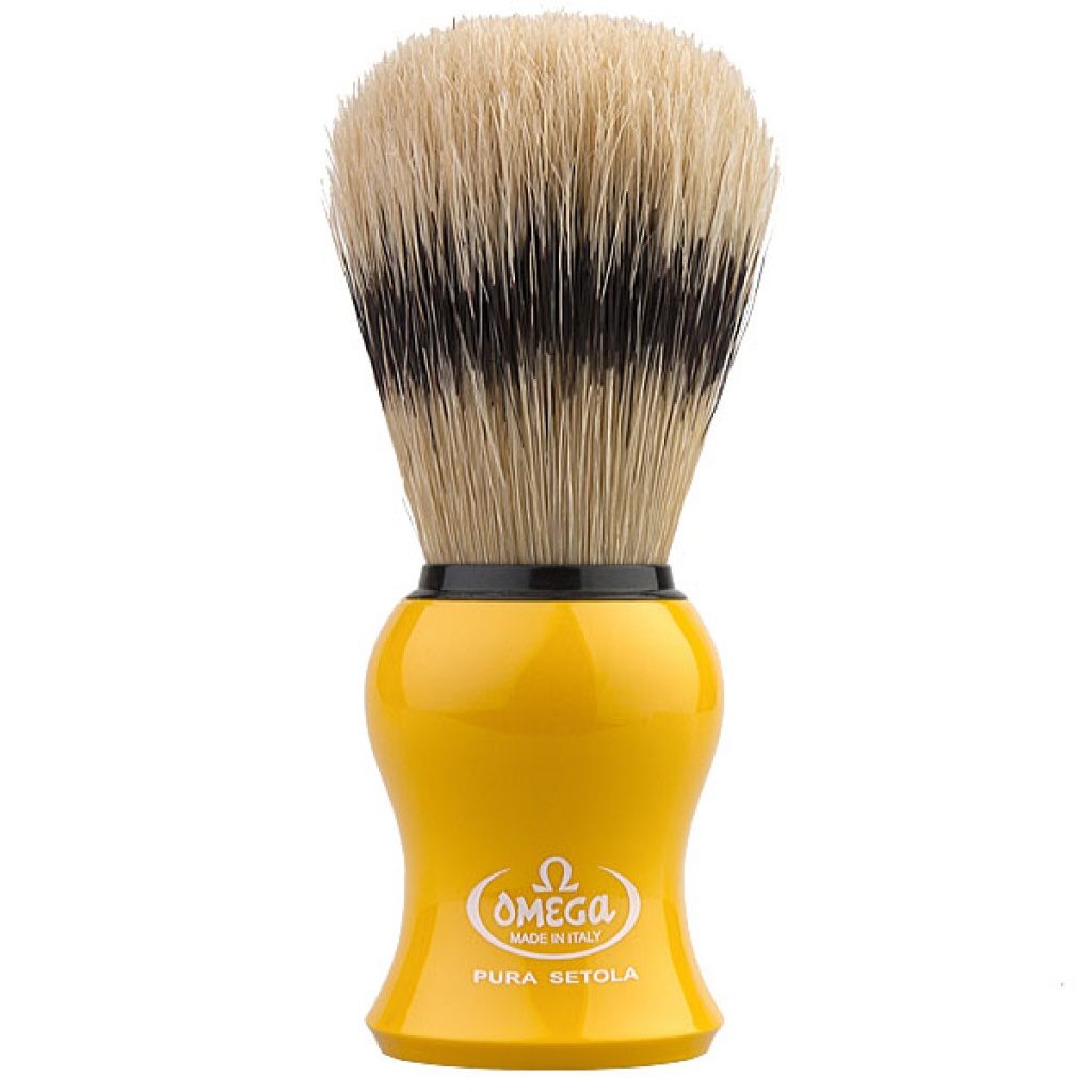 Štětka Omega z prasečích štětin, které se vyznačují svou větší hrubostí oproti jezevčím štětinám. To však není na škodu, protože mají nejen silnější masážní efekt, ale taktéž při nanášení mýdla či pěny na holení efektivně odstraňují odumřelou pokožku.