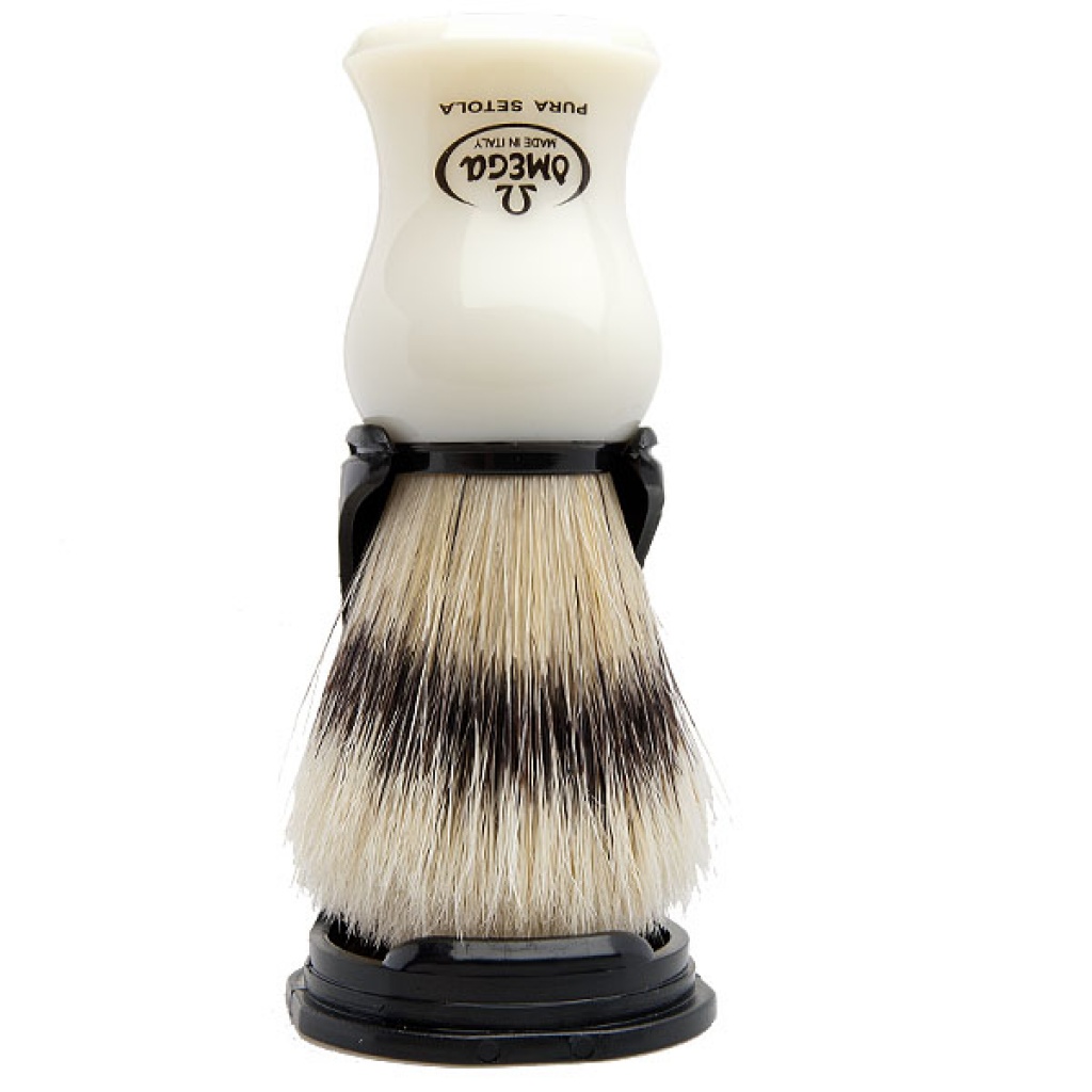 Štětka Omega z prasečích štětin, které se vyznačují svou větší hrubostí oproti jezevčím štětinám. To však není na škodu, protože mají nejen silnější masážní efekt, ale taktéž při nanášení mýdla či pěny na holení efektivně odstraňují odumřelou pokožku.