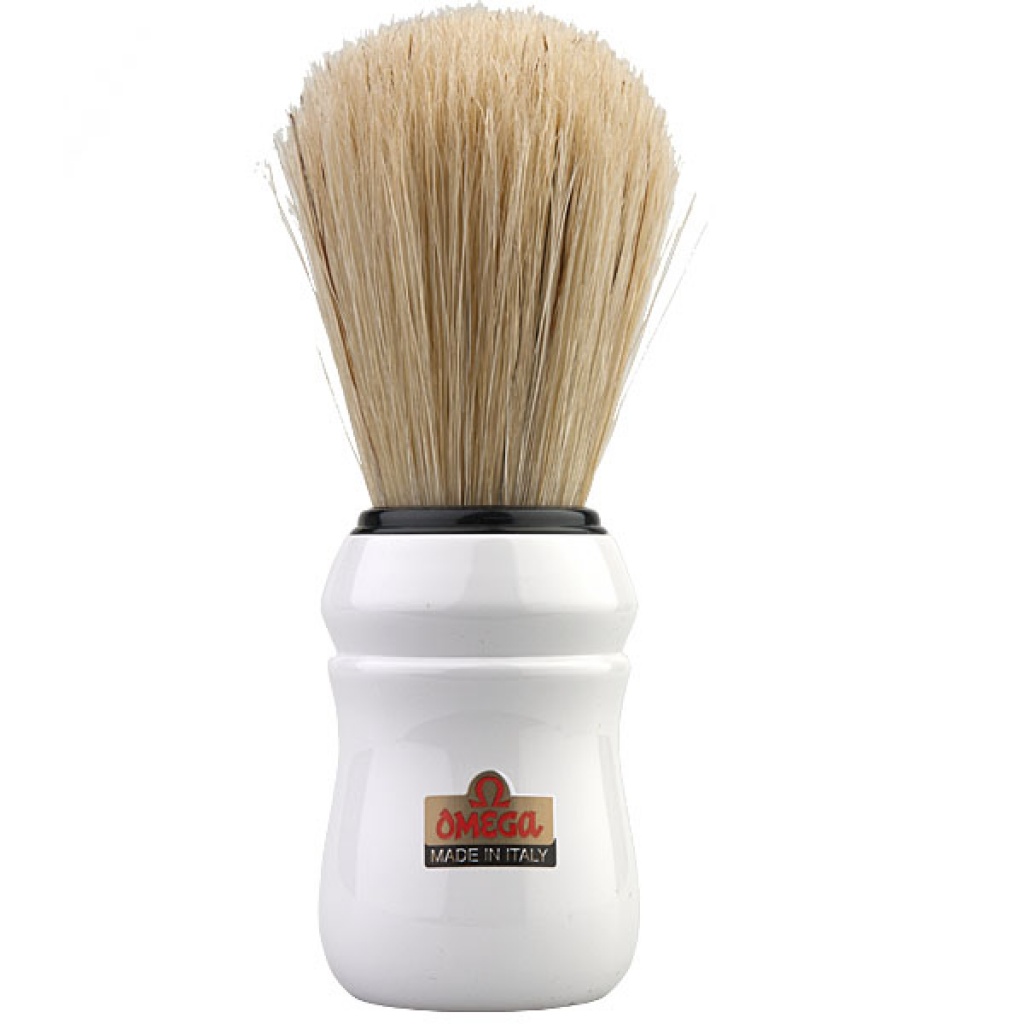 Štětka Omega z dlouhých prasečích štětin, které se vyznačují svou větší hrubostí oproti jezevčím štětinám. To však není na škodu, protože mají nejen silnější masážní efekt, ale taktéž při nanášení mýdla či pěny na holení efektivně odstraňují odumřelou pokožku.