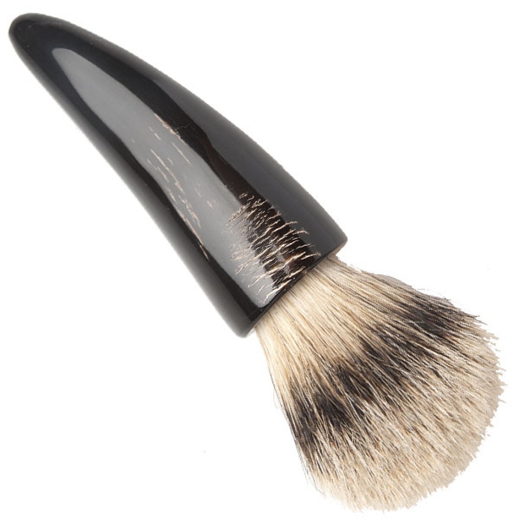 Luxusní stětka na holení s velmi jemnými štětinami jezevce (Super badger) a s leštěnou rukojetí z buvolího rohu. Součástí balení je chromovaný stojánek, na který se štětka zavěší.