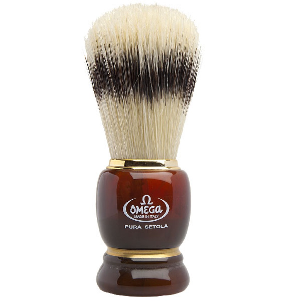 Štětka Omega z prasečích štětin, které se vyznačují svou větší hrubostí oproti jezevčím štětinám. To však není na škodu, protože mají nejen silnější masážní efekt, ale taktéž při nanášení mýdla či pěny na holení efektivně odstraňují odumřelou pokožku.