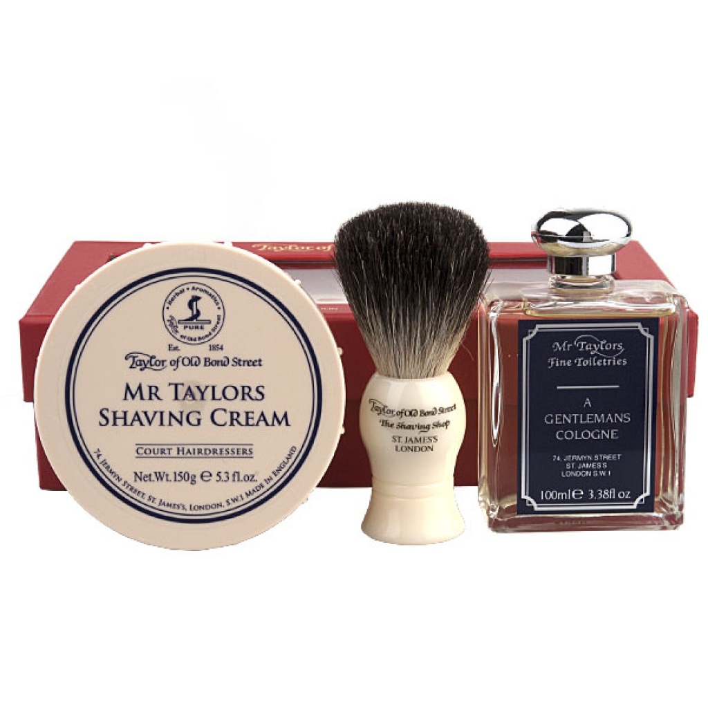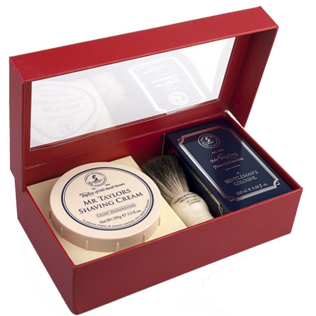 Dárková kazeta obsahuje štětku na holení Taylor of Old Bond Street P1020 Ivory s pravými jezevčími štětinami, krém na holení Mr Taylor 150 g, který vytváří bohatou pěnu a kolínskou Mr Taylor 100 ml s dřevitou, lehce kořeněnou vůní.