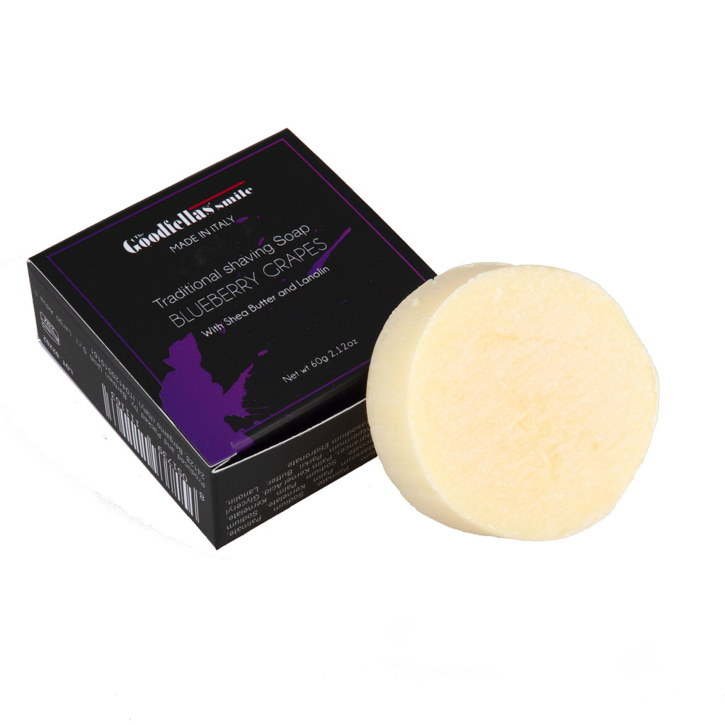 Tuhé mýdlo na holení s obsaženým bambuckým máslem pro hydrataci a výživu a s lanolinem proti vysušení pokožky. Kromě těchto užitečných složek má také výraznou ovocnou vůní po borůvkách a červených hroznech.