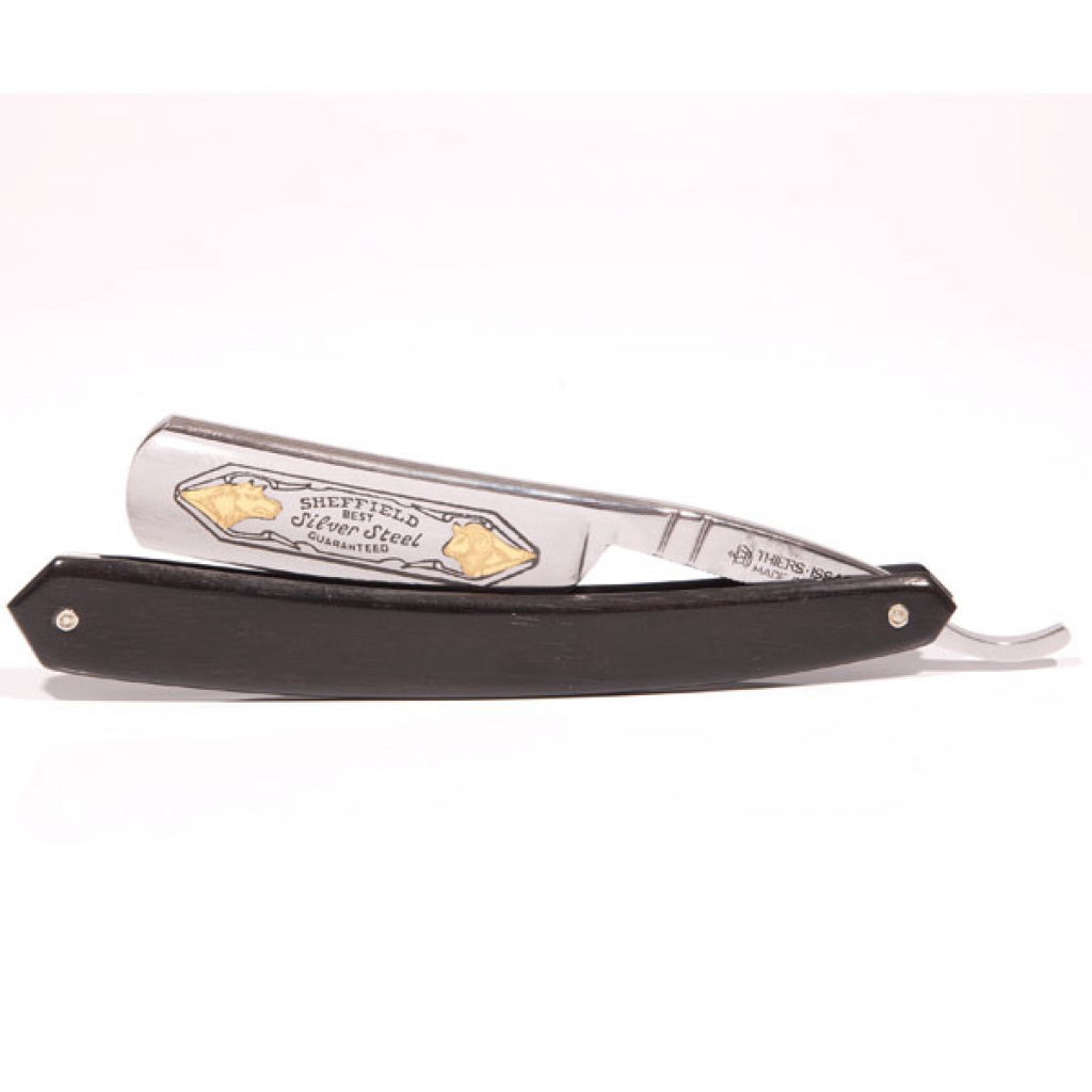 Tato nádherná plnodutá břitva je kovaná z vysoce kvalitní oceli Sheffield Silver. Je leštěná do zrcadlového lesku s 24 karátovou zlatou ochrannou známkou (Loup et Belier - ovce a vlk). Rukojeť je vyrobena z odolného ebenového dřeva.