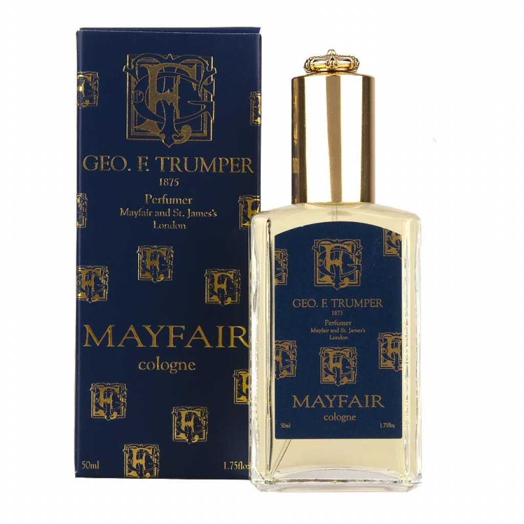 Tester smyslně pánské kolínské Mayfair s exotickými tóny bylinných směsí, tonka fazolí, bílého medu, lotosu a hrušky. Kolínská byla uvedena na trh roku 2021 k oslavě stého výročí prodejny Geo F Trumper v Londýně, v luxusní čtvrti Mayfair.