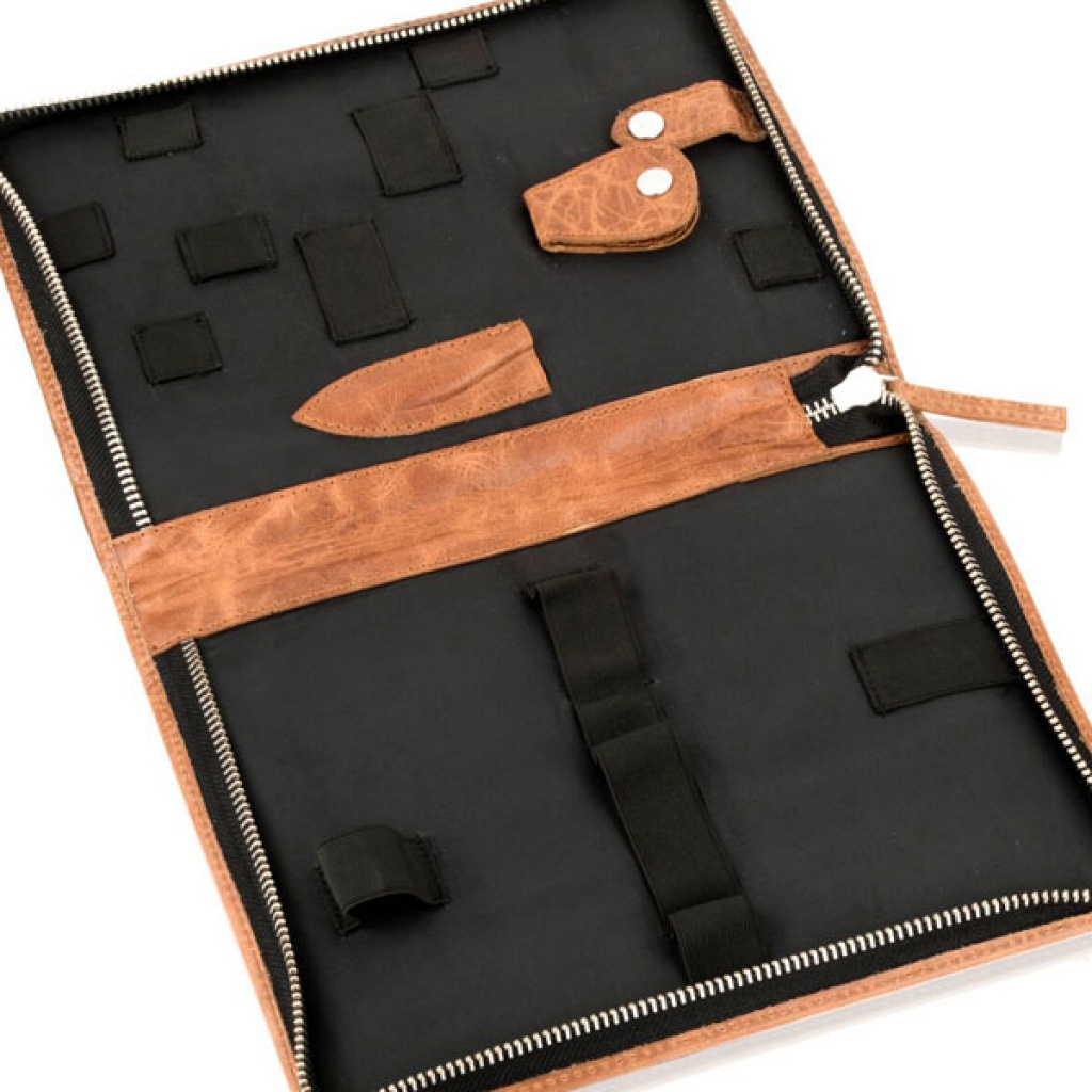 Hnědá toaletní taška s všitými gumičami a koženými úchyty vhodnými pro uložení manikůrek, strojku na holení, štětky na holení nebo naopak hřebenu na plnovous a oleje na vousy. Prostě všeho, co Vás napadne.