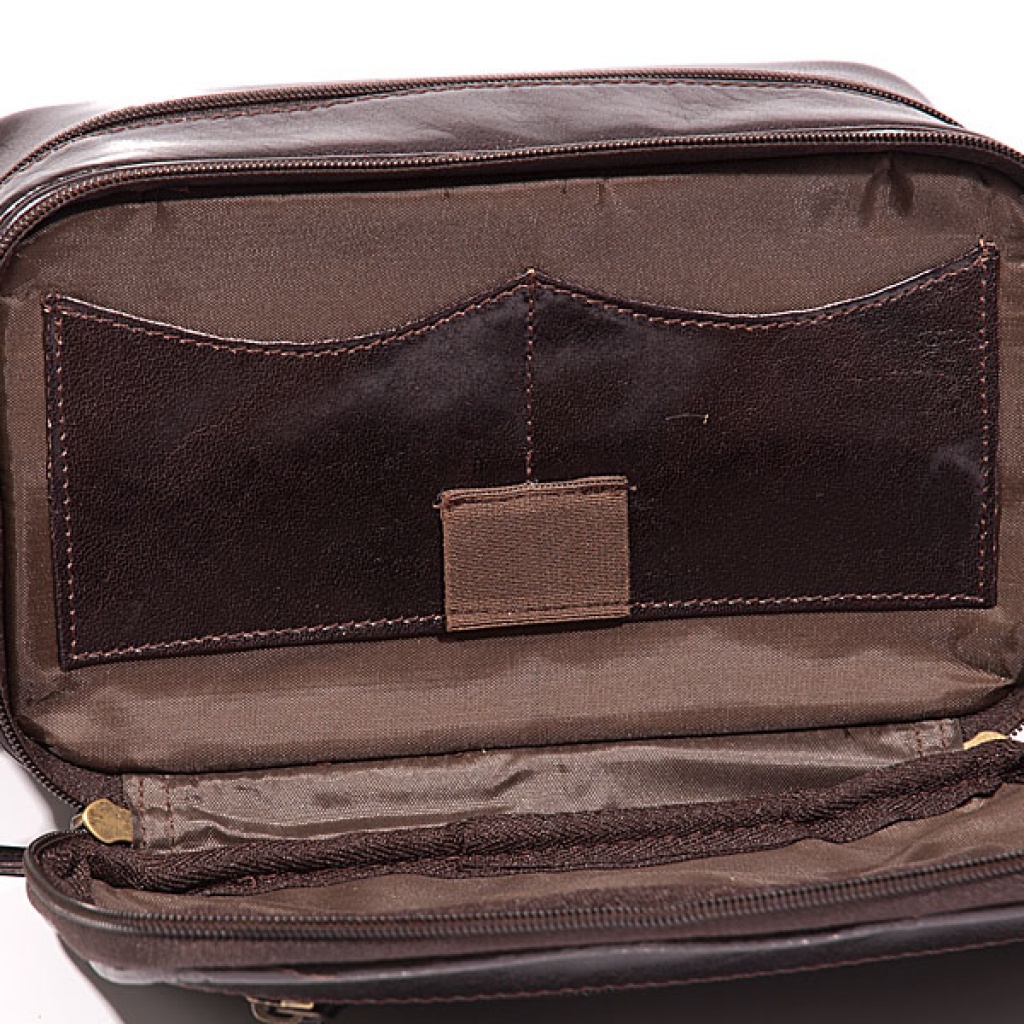 Tmavě hnědá kožená toaletní taška s velkým úložným prostorem doplněným o boční kapsy.