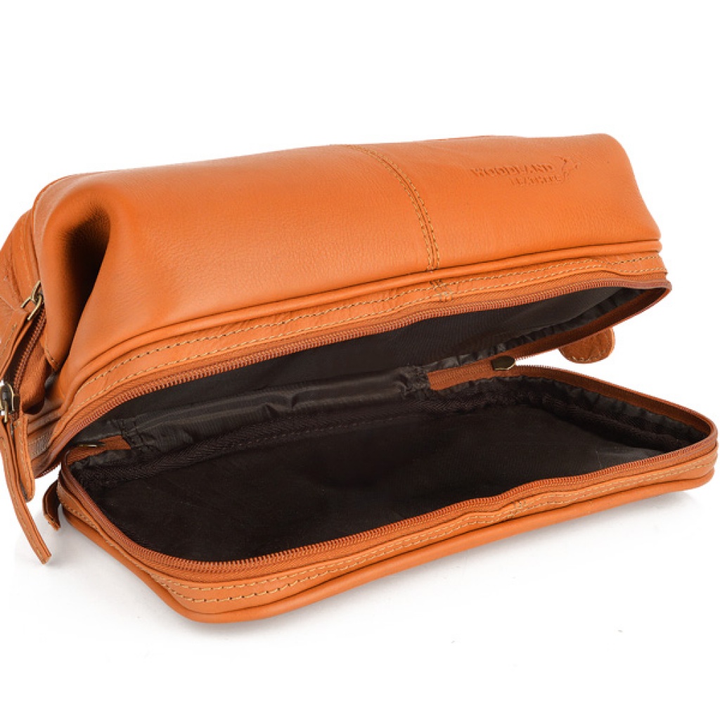 Prostorná toaletní taška vyrobená z kvalitní kůže s vodotěsnou podšívkou a menší spodní kapsou vhodnou pro oddělení mokrých věcí od suchých.